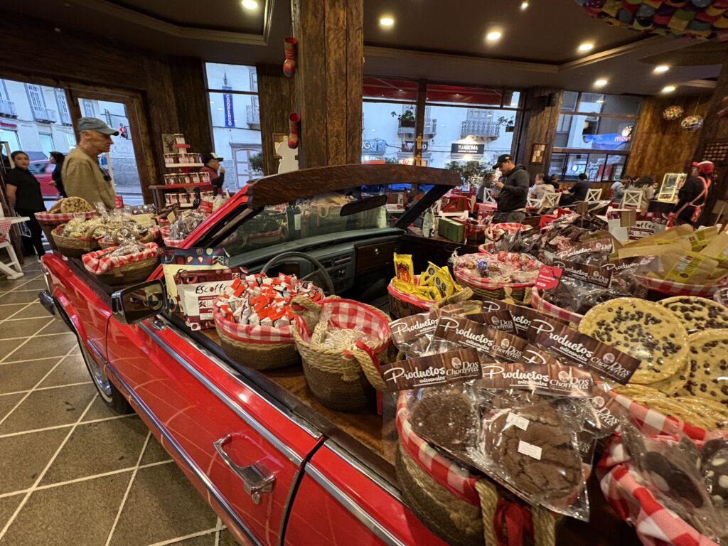 În Chocolateria Dos Chorreras unde ne aflam era veselie mare! Nu numai că era Carnaval dar a doua zi era și Sf. Valentin! 💝 Și să vezi desfășurare de ciocolată, panglici,💞 unele așezate pe o decapotabilă aflată chiar în interiorul cafeteriei!!
