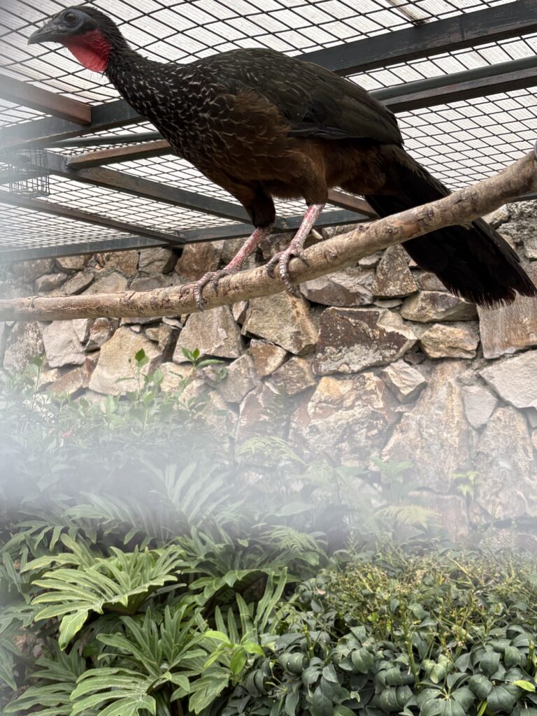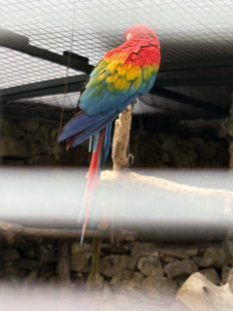 În voliere se aflau și diferite păsări mari, cu penaj colorat (papagali colorați macaws, vulturi albaștri chilieni sau… păuni!)