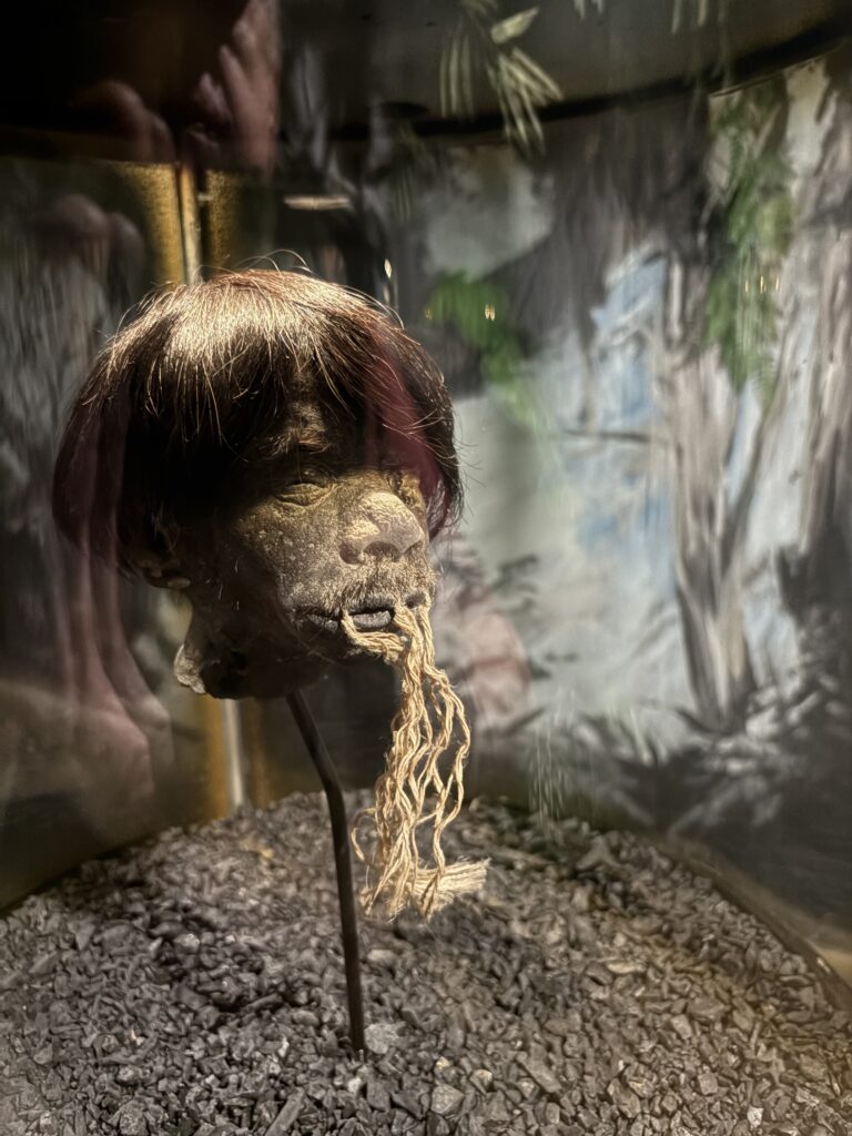 și care conține – expuse cu atenție – capete umane micșorate (îndepărtate de oase și fierte, sînt complet la scară, ca atunci cînd micșorezi un pulover la spălat).