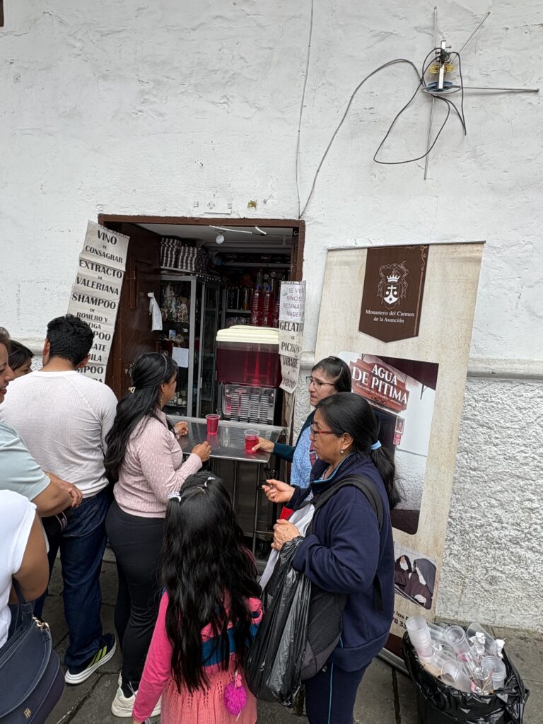În fine, am văzut tot azi, în afara mănăstirii Carmen de la Asuncionunde se află o piață de flori și coada la un mic magazin care vinde Agua de Pitimas, un elixir magic preparat de călugărițe conform unei tradiții vechi de 300 de ani.