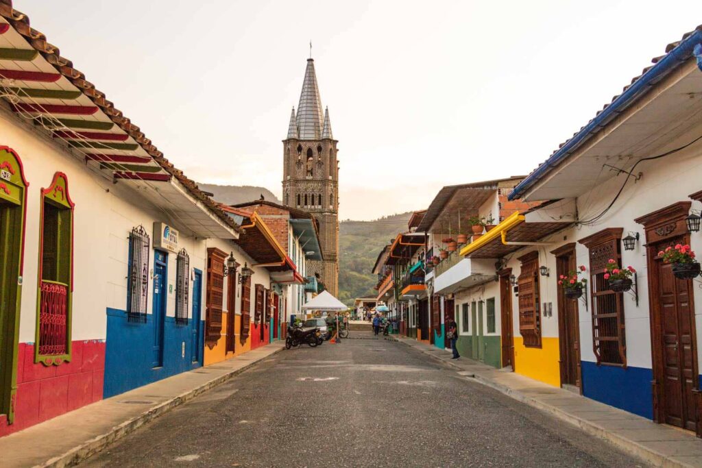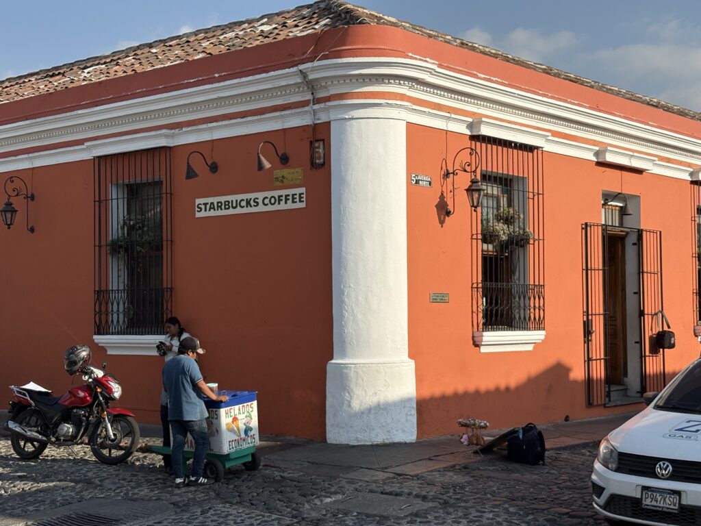 înconjurate de străzi colorate vesel, în galben, roșu (culorile spaniolilor) și bleu, alb (ale nativilor) însă NU înalte. Practic, acolo unde nu locuiește cineva se află o tienda, o prăvălioară cu orice, de la artizanat (chiar lucruri și combinații de culori deosebite) pînă la inevitabilele café cu băuturi variate: cafea caldă, rece, în amestec cu cacao, cu lichior, cu yerba buena, că doar ne aflăm într-o țară a cafelei!