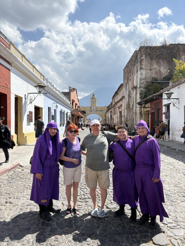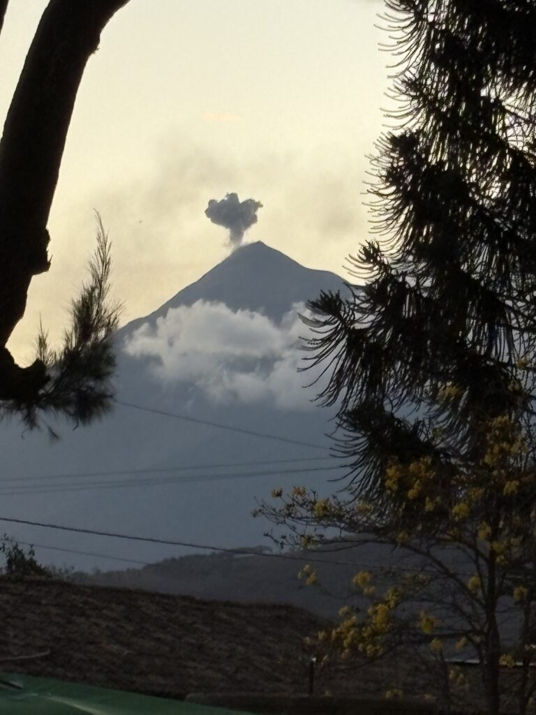 Orașul este situat pe fundul unei văi înconjurate de 3 (trei) vulcani 3 activi: Agua, Fuego și Acatenango. (Pe unul l-am fotografiat și eu pufăind!)