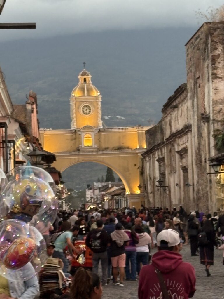 Situat pe o stradă pietruită (numită pur și simplu Calle del Arco) și în fața impunătorului Volcán de Agua, acest arc galben-șofran a devenit simbolul Antiguei și imaginea centrală de pe majoritatea cărților poștale. (Vreau să zic vederilor trimise pe WhatsApp, Instagram, Facebook fiindcă… și poșta din Guatemala a dat faliment!) Pentru critici, ar putea fi doar un alt arc, dar pentru localnici reprezintă rezistența orașului și o istorie care se întinde pe patru secole.
