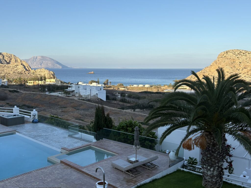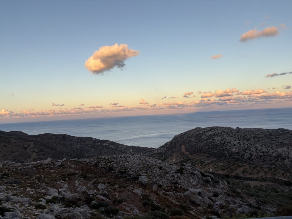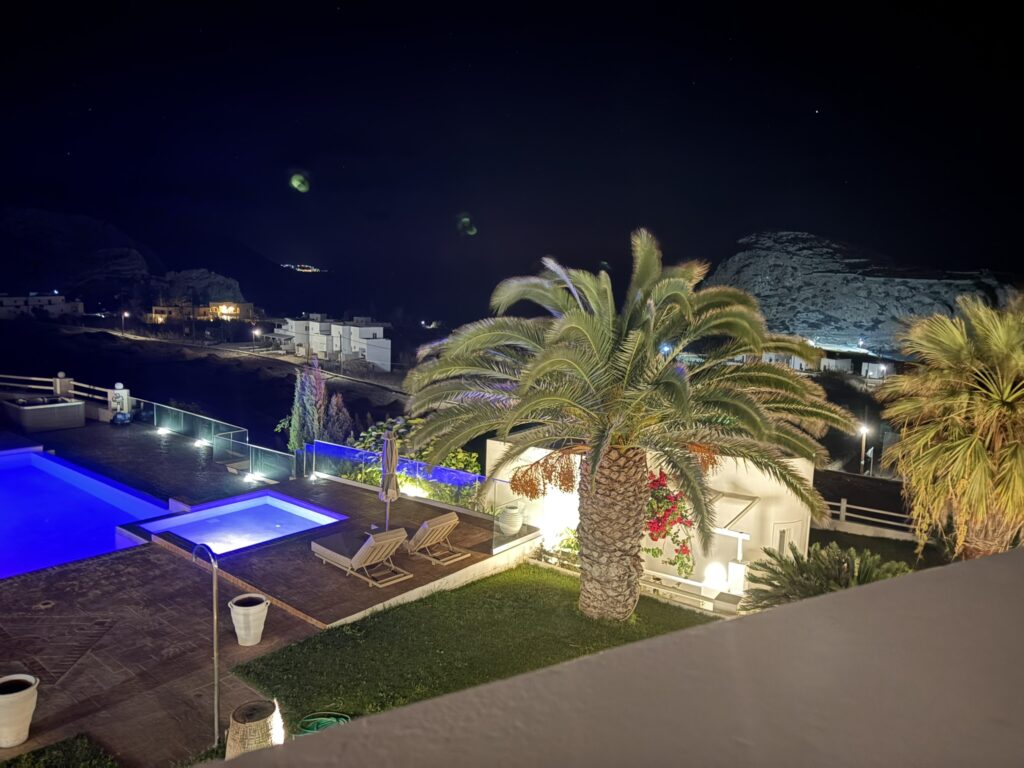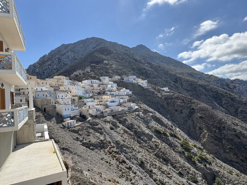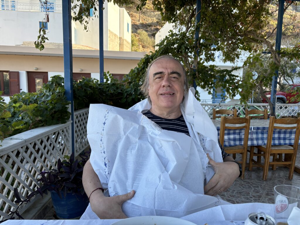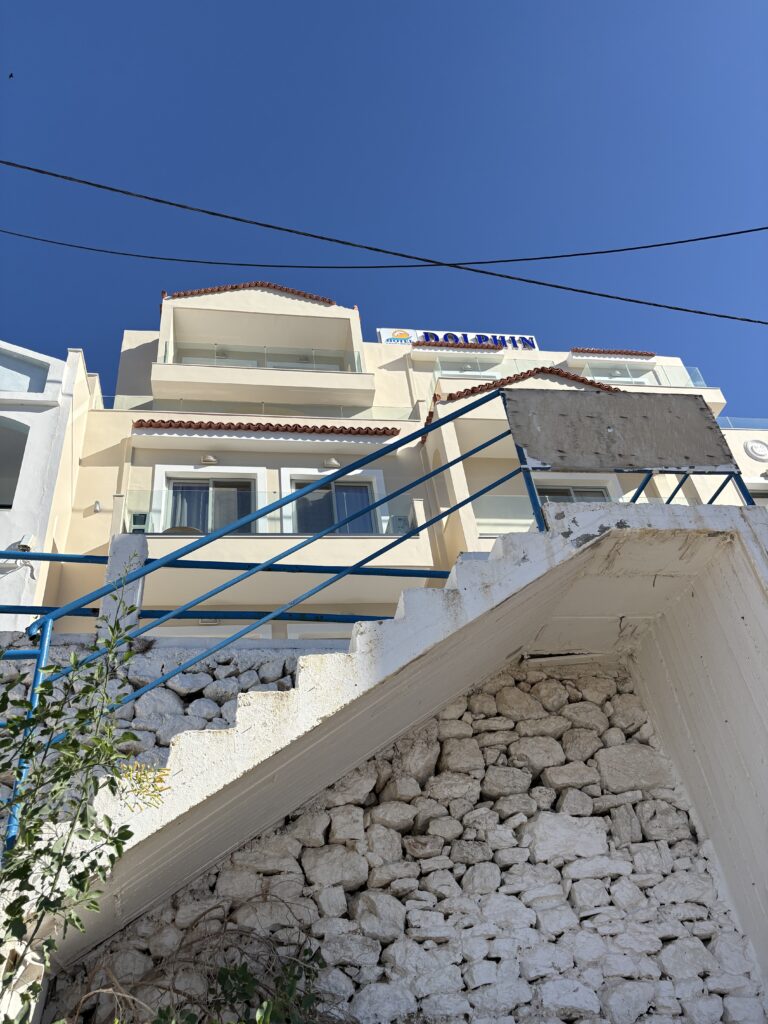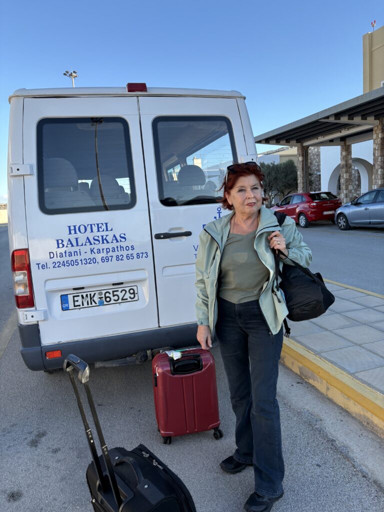 Am ajuns în cea de-a treia și ultima destinație din călătoria „de toamnă“ din 2025: un drum de 23 de km, făcut cu taxiul (transportul în comun e doar… „ilustrativ“ în Kárpathos) pe un teren accidentat, avîntat și muntos, de la Pigádia la Arkása cam într-o jumătate de oră. Practic am tăiat insula de la est la vest, în capătul ei sudic dar asta a însemnat mai întîi să ne cocoțăm pe coama munților… „Karpați“ ca să avem de unde coborî… A costat €35, dar alternativa nu exista așa că… Și i-am dat șoferului destinația noastră din Arkása: hotelul Arkása Palace la care NU făcusem vreo rezervare! (M-am bazat pe faptul că e final de sezon. Și bine am făcut. Evident am negociat un preț muult mai bun decît cu booking.com! 😀)