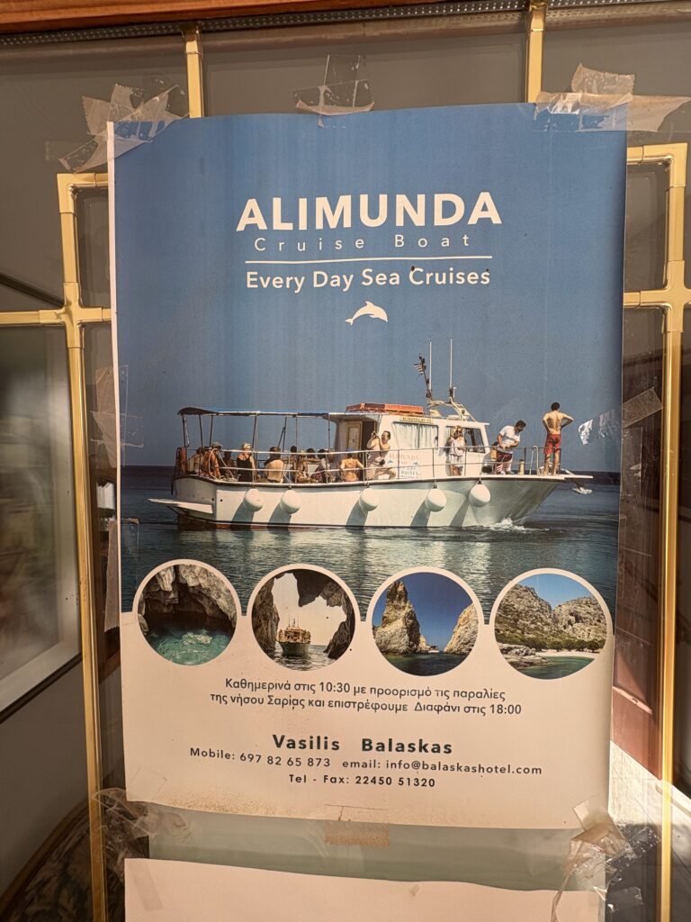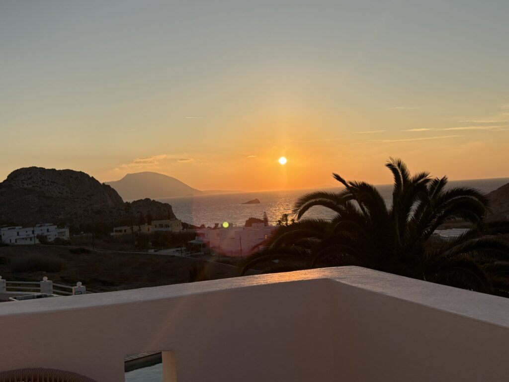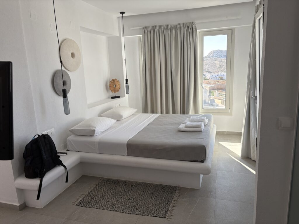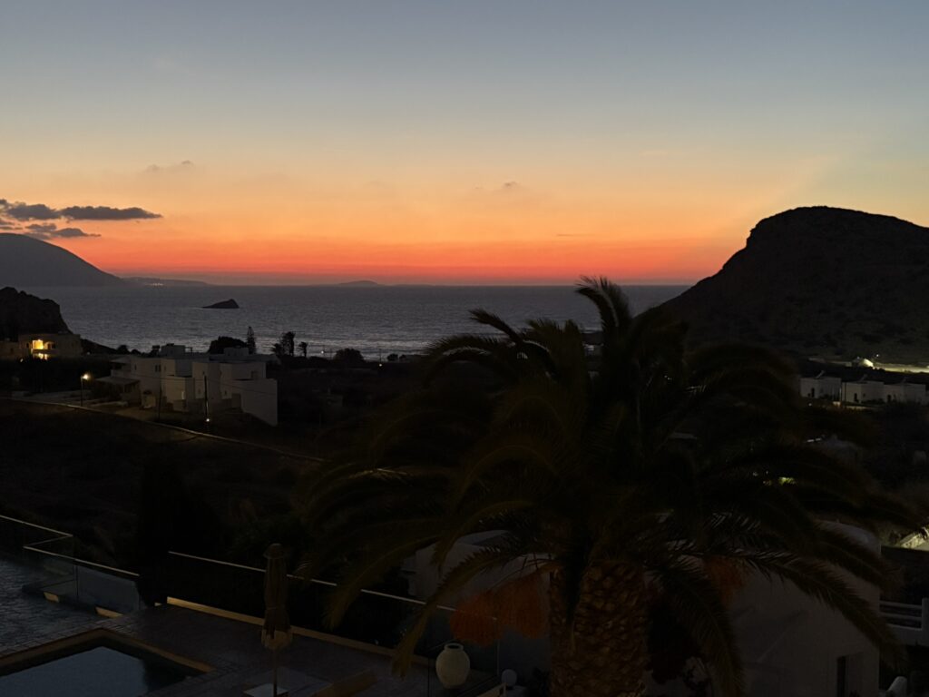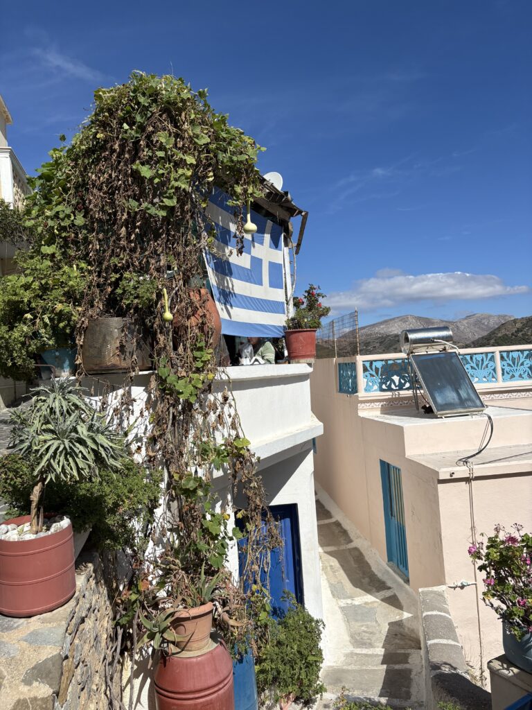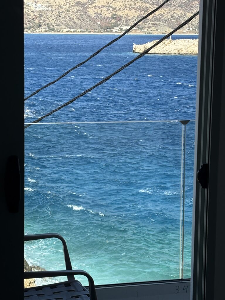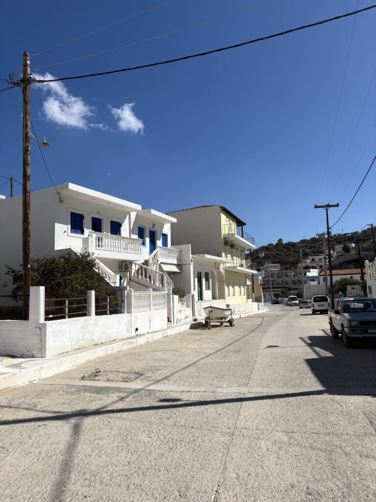 Am ajuns în cea de-a treia și ultima destinație din călătoria „de toamnă“ din 2025: un drum de 23 de km, făcut cu taxiul (transportul în comun e doar… „ilustrativ“ în Kárpathos) pe un teren accidentat, avîntat și muntos, de la Pigádia la Arkása cam într-o jumătate de oră. Practic am tăiat insula de la est la vest, în capătul ei sudic dar asta a însemnat mai întîi să ne cocoțăm pe coama munților… „Karpați“ ca să avem de unde coborî… A costat €35, dar alternativa nu exista așa că… Și i-am dat șoferului destinația noastră din Arkása: hotelul Arkása Palace la care NU făcusem vreo rezervare! (M-am bazat pe faptul că e final de sezon. Și bine am făcut. Evident am negociat un preț muult mai bun decît cu booking.com! 😀)