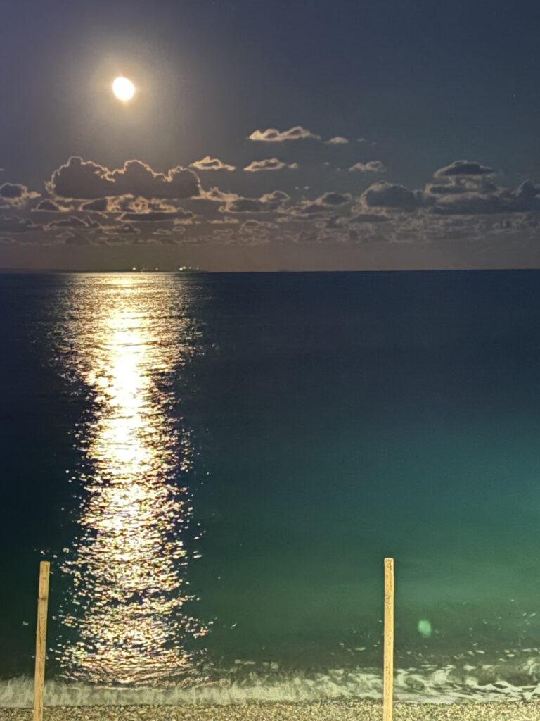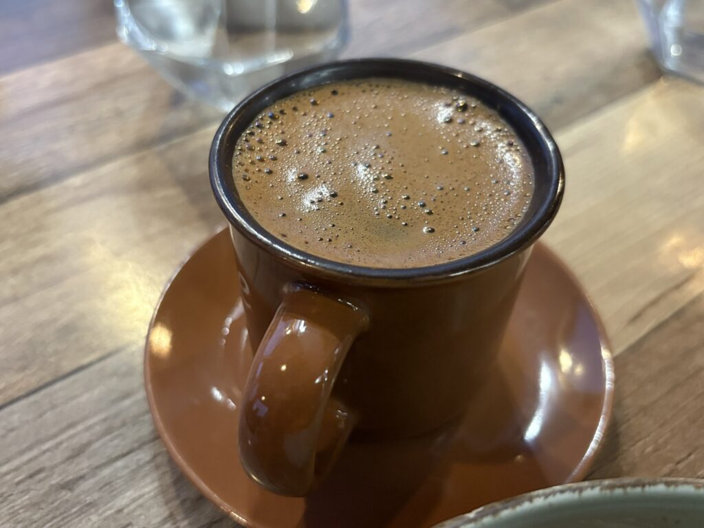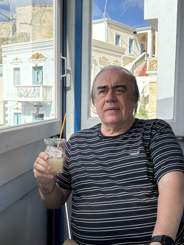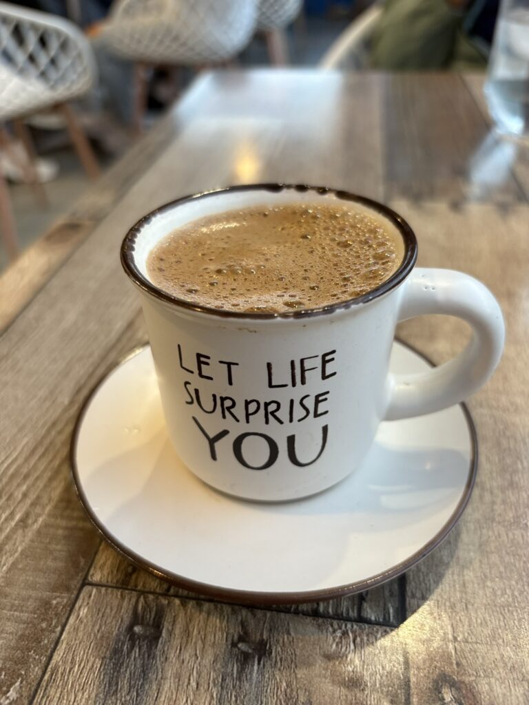 Ultima seară am păpat χταπόδι – htapódi – caracatiță la restaurantul Parthenon (care rămăsese, practic, fără concurenți, din moment ce aceștia se retrăseseră la… iernat☃️), Rodica o σουβλάκι μερίδα, un souvlaki cinstit, de porc, și, pentru desert, ne-am mișcat din nou spre cafeneaua Sweet Time. Dar nu numai pentru desert. A doua zi nu ne mai puteam lungi la micul dejun așa că pe lîngă o plăcintă cu mere și această ceașcă de cafea cu un îndemn filozofic