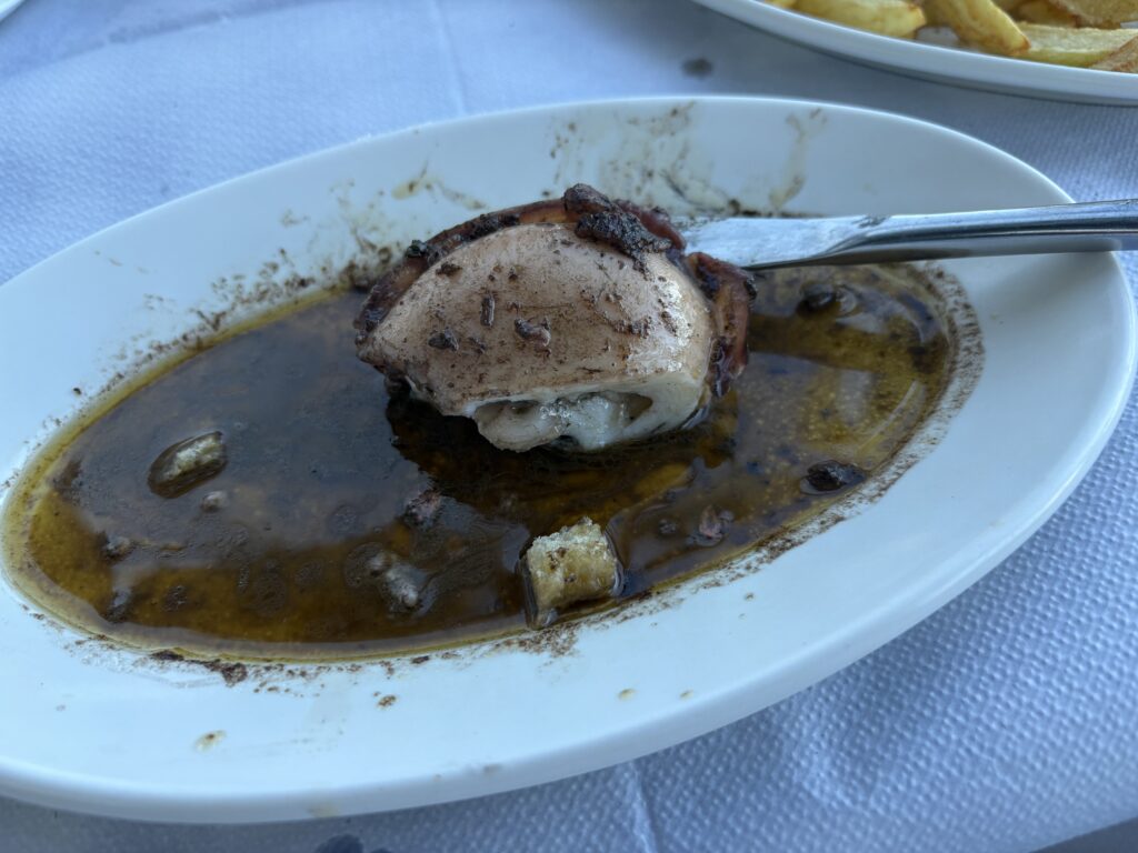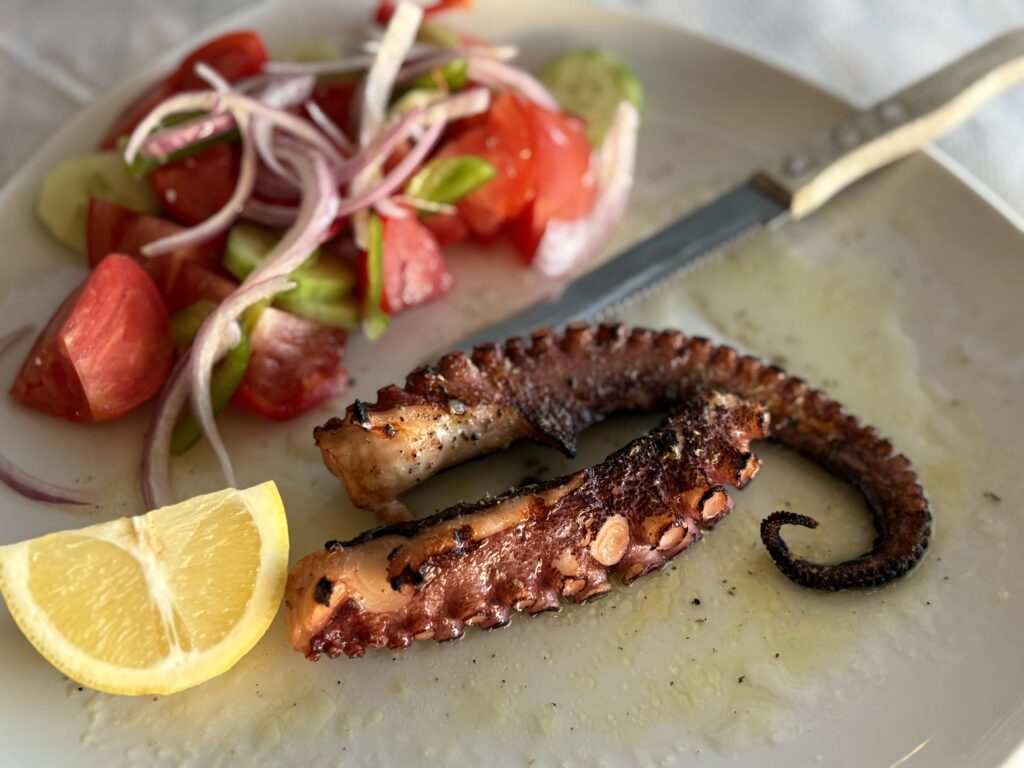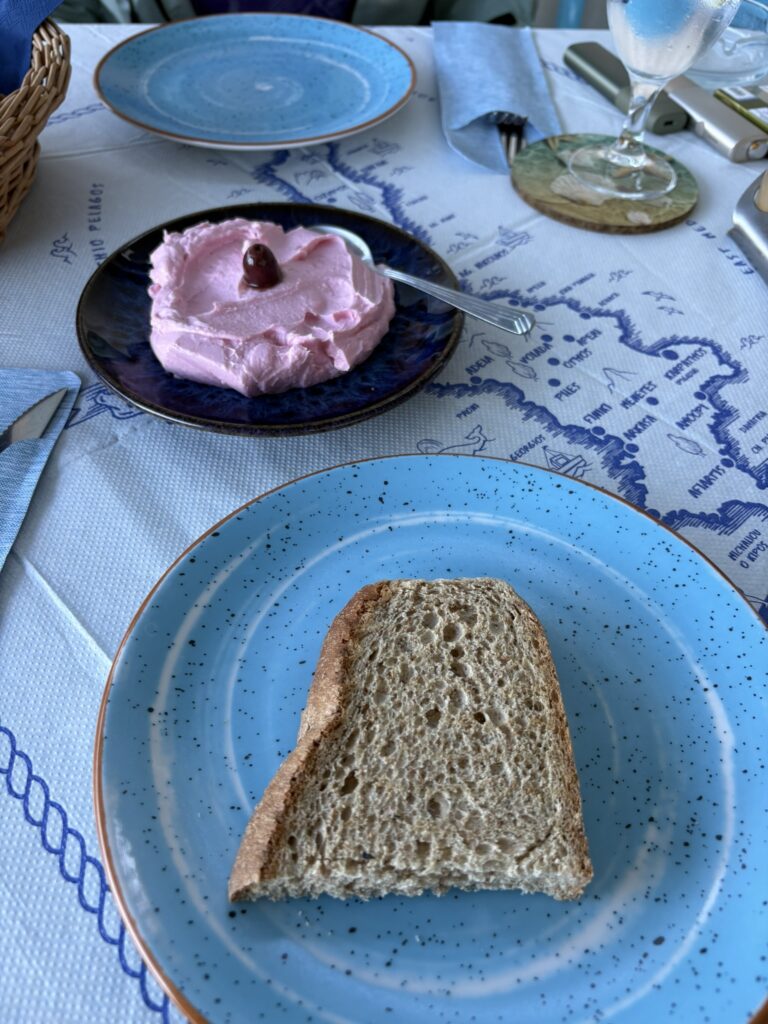 …pînă la urmă Immakolata a dat drumul bucătăriei mai devreme, terasa s-a umplut imediat și am primit, în sfîrșit, τσιπούρα (tsipúra – dorada) visată care, da, a fost minunată!