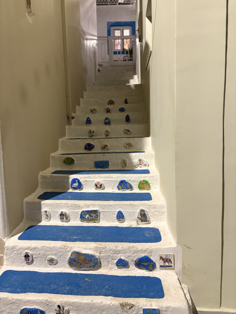 Ne-am cazat cum s-a văzut mai sus și am căutat „rutele“ spre restaurantele locale: se făcea ora mesei și în Grecia, ca și în România, nu trebuie să aștepți pînă seara ca să se deschidă locanda – e deschisă toată ziua. (Dacă vreți puteți vedea aici un filmuleț scurt, de 2 minute, despre Arkása – pe treptele astea care duc spre centrul satului și unde se află 3-4 restaurante am tot coborît și urcat și noi.) Am întrat în restaurantul Petaluda și am aflat că avem noroc! ??? Azi e ultima zi cînd e deschis (era 15 octombrie), ne-a informat chelnerul. De mîine închidem până cam pe 10 decembrie. Păi, zic, cine mai vine aici în decembrie? Mai aveți turiști? Nu, răspunde omul, turiști nu mai sînt, dar vin ai noștri, grecii, de sărbători…