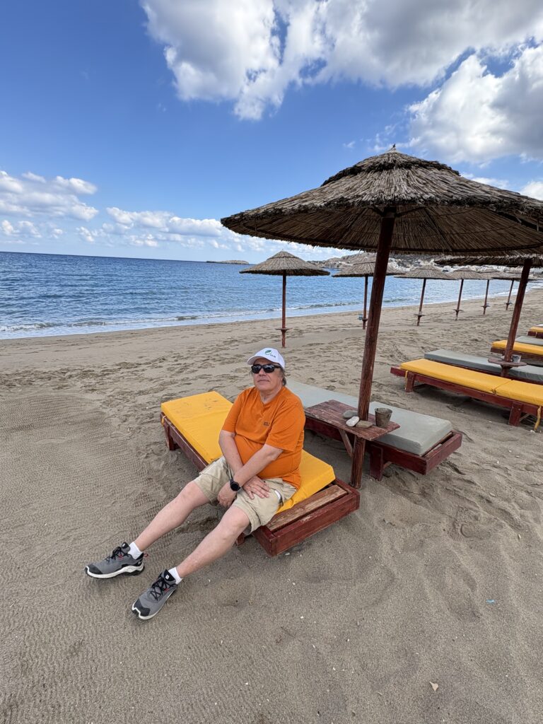 Ei bine, vineri dimineață am „acceptat“ o clătită cu miere din partea Mariei, tînăra manager de la Arkása Palace, am finalizat aranjamentele financiare (adică am plătit cu cardul cazarea și, așa cum mă gîndisem, a fost încîntată că am plătit în numerar micul dejun – îi datoram măcar asta, ce Dumnezeu, sîntem în Balcani, nu?), apoi, în sfîrșit, am ajuns la plajă!