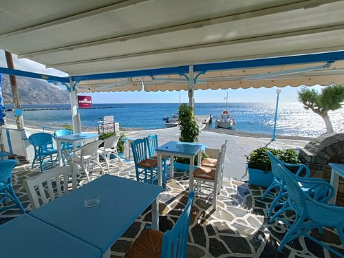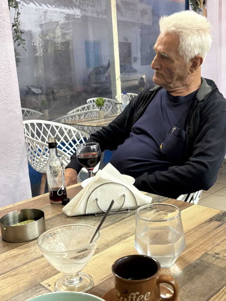 (Atenție! Cafeaua grecească are zahărul adăugat din principiu…) Ni s-a alăturat la masă (toate locurile erau ocupate) un bărbat sobru, cu părul alb, un obișnuit al casei de vreme ce i s-a adus imediat o sticluță minusculă de vin fără să o fi cerut. A băut-o și a plecat la fel de tăcut cum venise.
