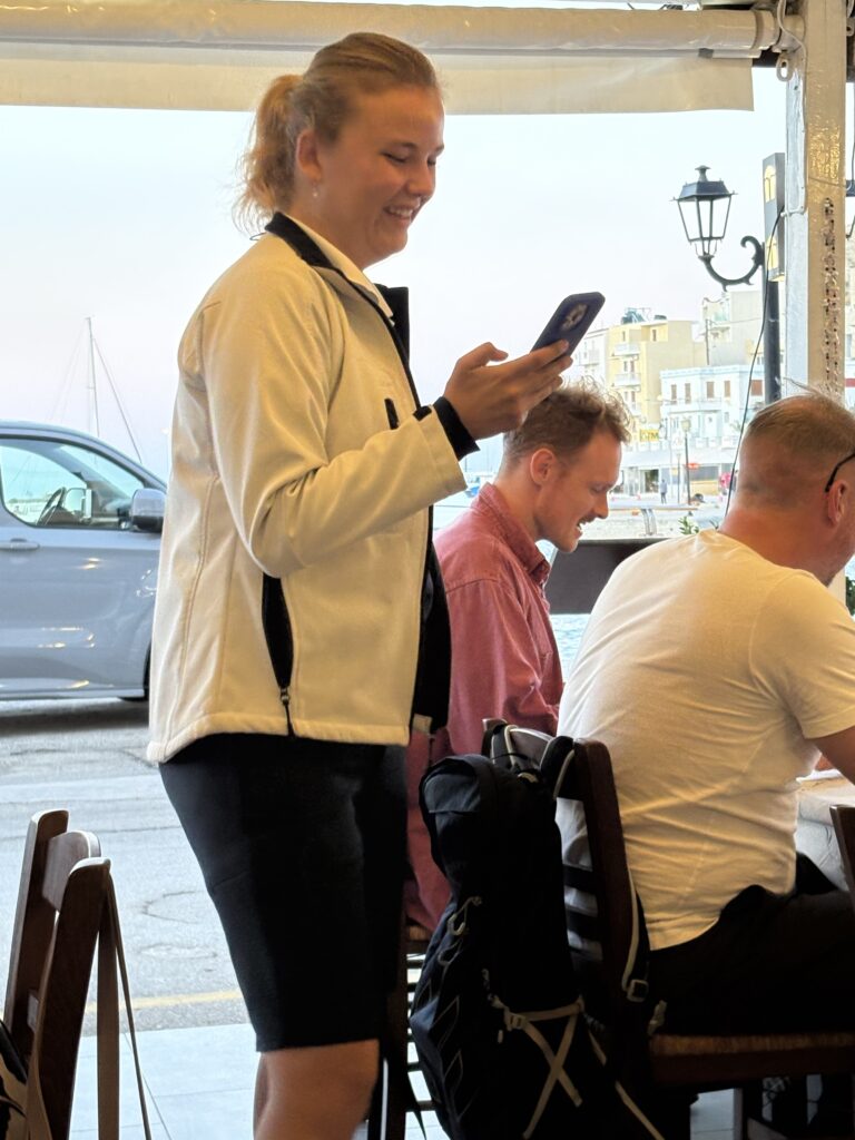 A fost singura data cînd am renunțat amîndoi, voluntar, să ne terminăm porțiile – erau IMENSE! Desertul ne așepta la vreo 20 de metri mai încolo, la cafeneaua-crêperie-gelaterie Sweet Time. Aici se strîngeau se pare cam toate femeile din sat, dornice de conversație la o cafea, firește. Am cerut o cafea… „turcească” tinerei patroane (ca să înțeleagă cam ce doream), m-a corectat, bineînțeles: „grecească“, dar… am obținut ce doream: nu espresso, nu filtru, ci o cafea-cafea!