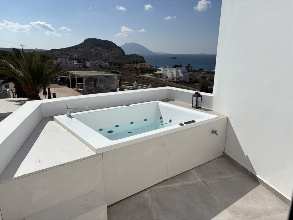 Hotelul ales e, de fapt, un complex de vile de lux, din balcoanele cărora se zărește minunata panoramă a golfului Arkása. De unde venea „luxul“ ? Aveam două balcoane (nicio diferență deocamdată față de locuința din București!), doar că într-unul se afla un jacuzzi, cu vederea spre bazinul impecabil din grădina hotelului, iar în celălalt o masa și două fotolii în care era musai să stai la răsăritul și la apusul soarelui pe Marea Egee și să-ți pui întrebări… existențiale: Ce e Omul? Unde sînt Zeii? ș.a.m.d.