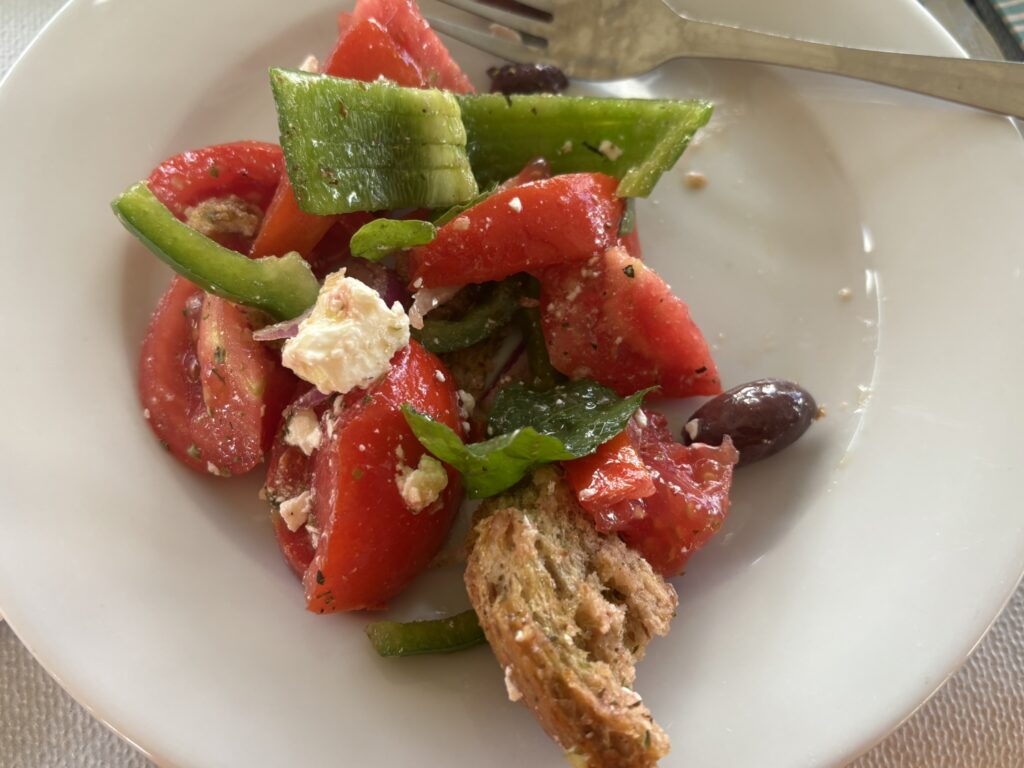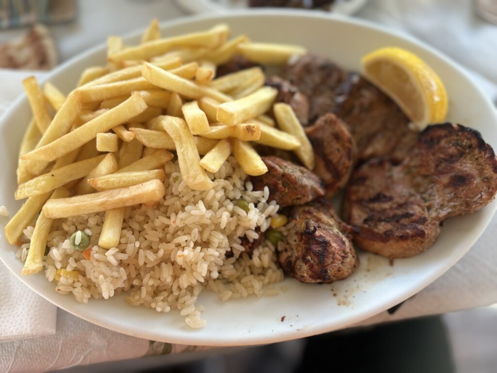Fericiți de norocul care dăduse peste noi (🤦🏻♂️) am ales ca aperitiv o salată locală (adică grecească în care se mai punea și o pîine veche la înmuiat), niște rondele de ceapă prăjită, apoi… am făcut imprudența să alegem eu un filet de porc, iar partenera mea de T-tb niște coaste (credea ea).