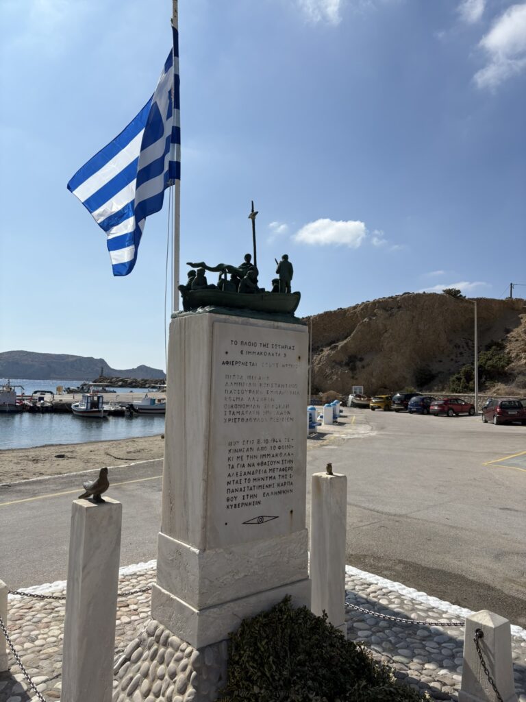 Ei bine, cheia ne-o dă acest mic monument care reprezintă barca pescărească Immakolata. În august 1944 au plecat cu barca asta din Finíki 7 oameni care au dus vestea eliberării insulei ocupate de germani și italieni guvernului grec în exil care se afla în Egipt, la Alexandria! Frumos… Acum, în mileniul III, germanii și italienii, ni s-a povestit, sînt peste tot în sezonul estival și toată lumea, inclusiv grecii 😊, sînt foarte fericiți! Ce poate face un pește bun… 🐬