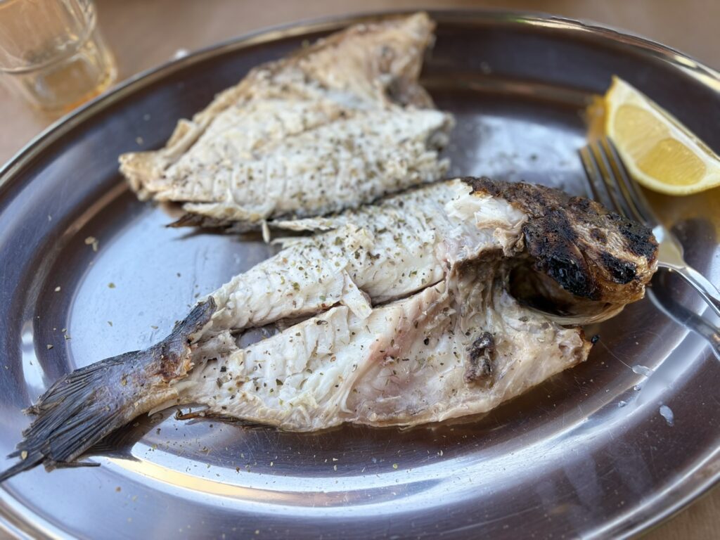 De ajuns am ajuns rapid, chiar prea rapid pentru ora la care singurul bastion culinar rămas deschis aici, restaurantul Immakolata, începea să-și servească clienții. Ne-au spus ora 16 și am mai aflat că pot opta pentru una dintre cele două dorade care mai rămăseseră. Una e a mea! am confirmat imediat. 😋