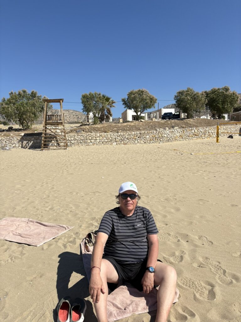 Plaja de la Arkása la care ne-am dus, Ag. Nikolaos, era una din cele mai mari din toată Kárpathia, avea nisip foarte fin, cu o coborîre foarte lină spre marea verde… Acum trebuie să spun că deși ne place la plajă, aproape de apa mării, momentele în care chiar am stat la plajă, la soare, pe toate insulele lumii în care am fost în ultimii 20 de ani, se pot număra pe degete. Mi-e frică de radiațiile din ce în ce mai puternice, ăsta e purul adevăr… Dar că e plăcut, da, sigur, e minunat…