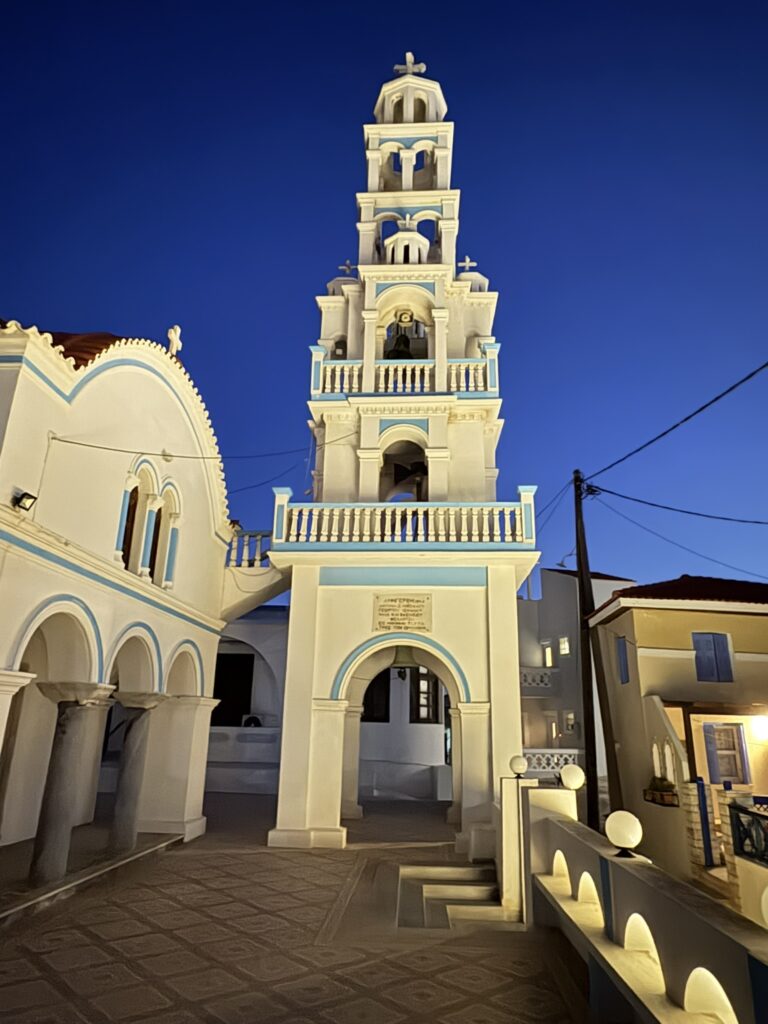 Pe drumul de seară ne-am suit (nu puteam rata, era ultima seară) pe colina Paleokastro pe care se află biserica Ypapanti, a cărei turlă se vede de oriunde la Arkása. Era liniște, se auzeau și greierii, în depărtare se vedeau și luminile din golful Finíki.